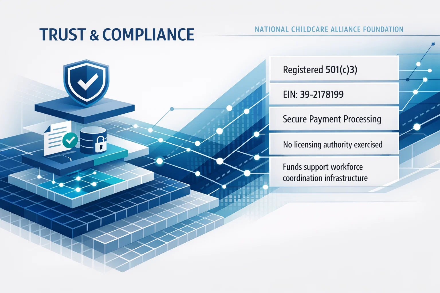 Strengthen the Workforce Behind America’s Childcare System. Support compliance coordination, workforce stability, and access to essential benefits for childcare providers nationwide. Make a Contribution Become a Strategic Partner NCAF is a 501(c)(3) nonprofit organization. WHY YOUR SUPPORT MATTERS Workforce Stability Supporting onboarding coordination and workforce retention systems. Access to Benefits Expanding access to workforce stability tools and benefit pathways. Compliance Resource Guide Helping providers navigate state requirements through structured guidance. HOW PARTICIPATION WORKS Individual Supporters Contribute to national workforce stabilization efforts. Support the Mission Corporate Sponsors Align your organization with childcare workforce development. Explore Sponsorship Government & Agencies Collaborate on workforce infrastructure alignment initiatives. Schedule Strategic Discussion DONATION OPTIONS Option A: One-Time Contribution $50 $100 $250 $500 Custom Amount Option B: Monthly Supporter $50/month $75/month $100/month Custom Option C: Program-Specific Giving Select TypeWorkforce Onboarding Access $49 (Onboarding)Benefits Stability Access $99 (+ Onboarding)State Resource AI Expansion $129 (+ Onboarding + Benefits)General Support FREE ENTRY TOOL (COMPLIANCE SNAPSHOT) TRANSPARENCY & IMPACT Providers Engaged States Supported Workforce Registrations Coordinated Benefits Pathways Expanded CORE SERVICES (PRIMARY BUSINESS) TRUST & COMPLIANCE Registered 501(c)(3) EIN: 39-2178199 Secure Payment Processing No licensing authority exercised Funds support workforce coordination infrastructure Looking to Collaborate at Scale? NCAF welcomes strategic partnerships that strengthen childcare workforce infrastructure nationwide. Schedule a Conversation (Calendar) Join Us in Strengthening the Workforce Behind Our Children. Can you increase the font size, and each item a one-line hover or expandable micro-description. Contribute Today Explore Partnership Volunteer System